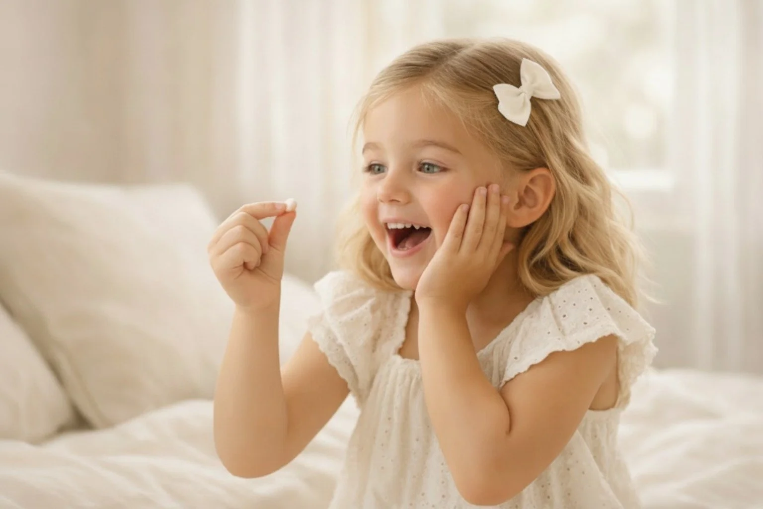 Place the tooth in the My Lost Tooth pouch (or a small safe spot) and set it where it’s easy to find, often near the bedside. The goal is simple: secure, easy to locate, and calm for the morning reveal.